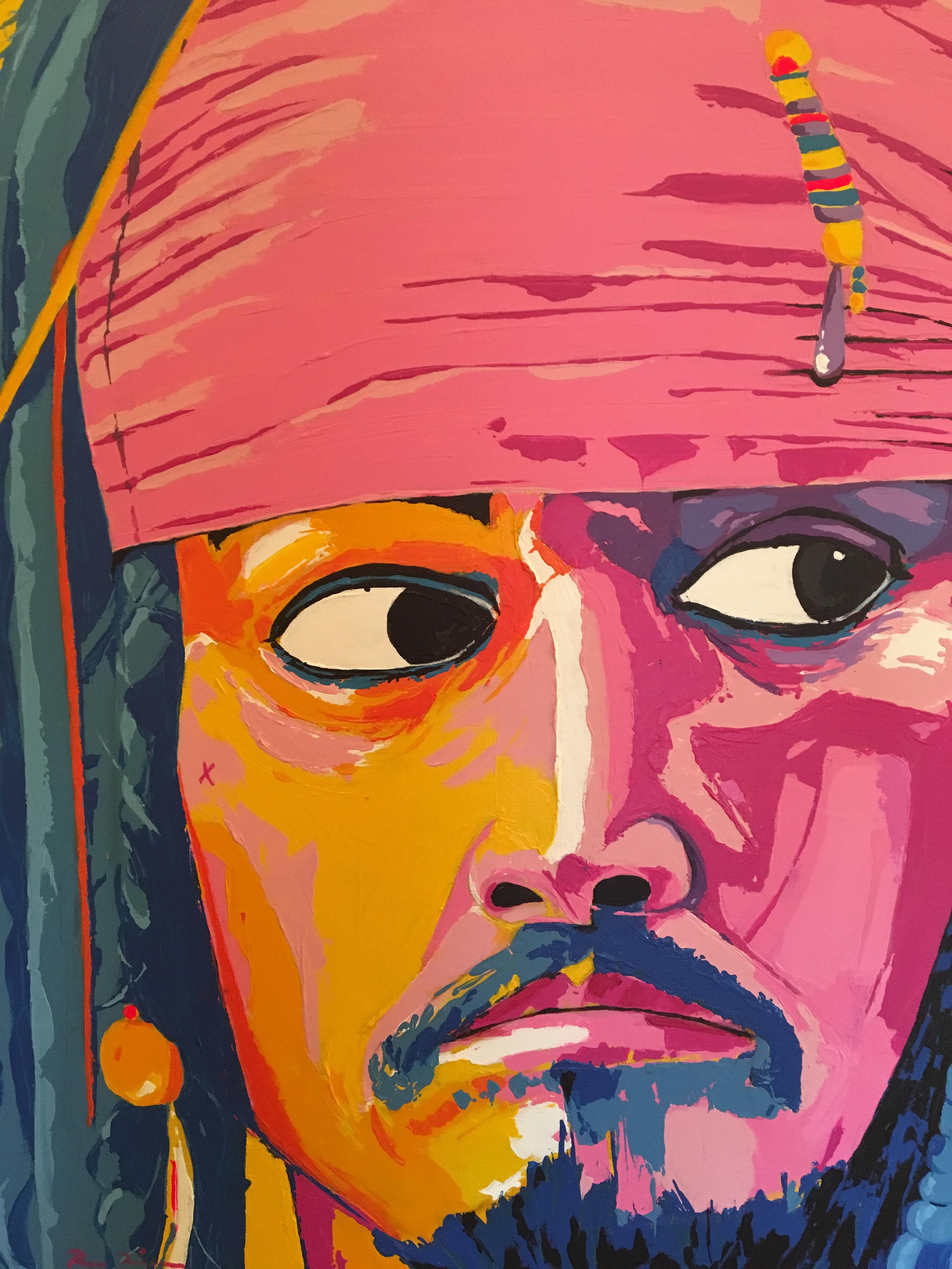 This is a portrait of the incomparable Captain Jack Sparrow, played by Johnny Depp in the movie Pirates of the Caribbean. The painting captures his humor and boldness, with bright colors. This artwork is painted with acrylic paint on canvas using a palette knife for texture.