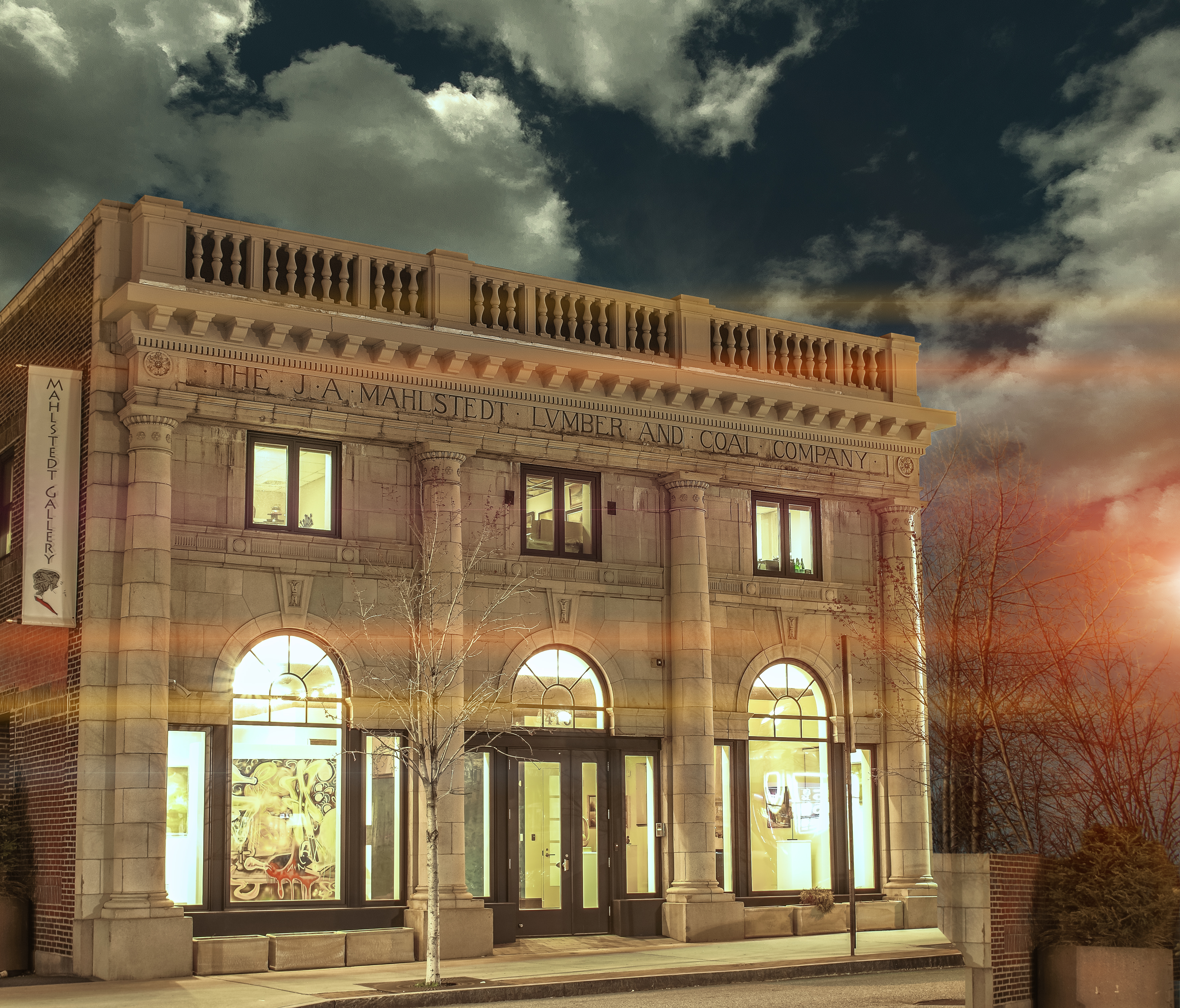 The iconic Mahlstedt Gallery is located in a beautiful neo-classical two-story building. This historic landmark (2020) was initially built in 1920 for the J. A. Mahlstedt Lumber and Coal Company, and today houses all 10,000 sqft of dazzling gallery space.